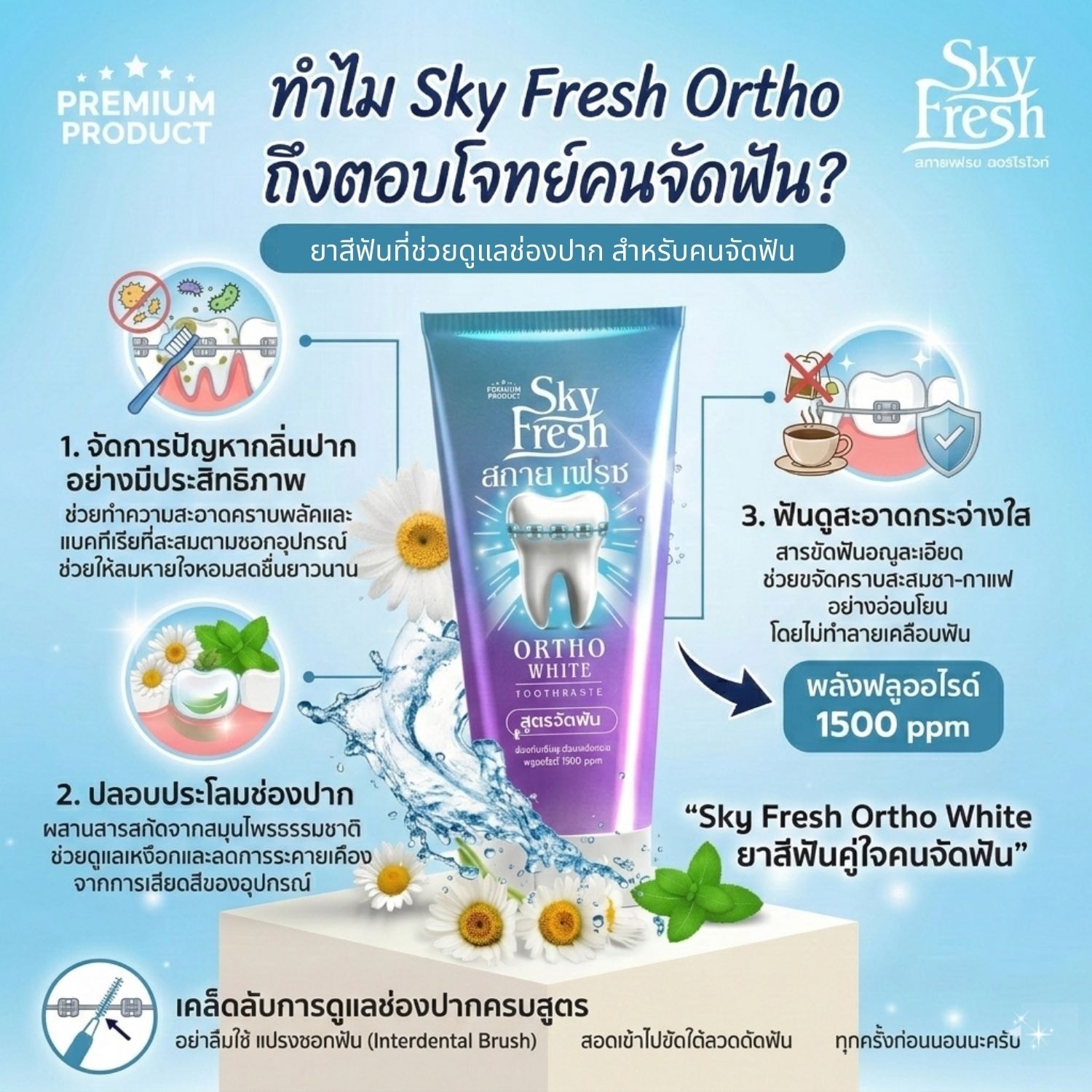 หากคุณกำลังมองหาตัวช่วยดูแลช่องปากที่ครอบคลุมและจบในหลอดเดียว เพื่อความสะดวกในการดูแลความสะอาดระหว่างวัน เราขอแนะนำ Sky Fresh Ortho White Toothpaste ผลิตภัณฑ์ที่ออกแบบมาเพื่อไลฟ์สไตล์ของคนจัดฟันโดยเฉพาะ