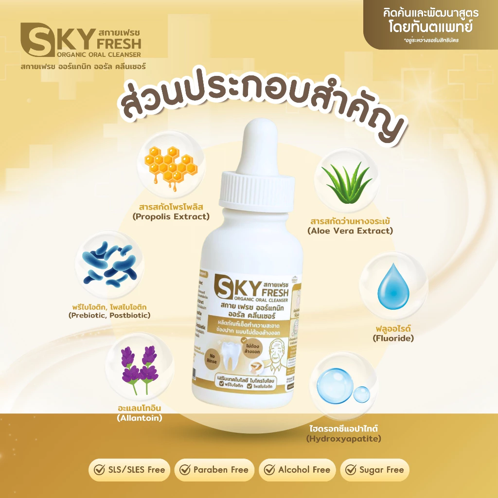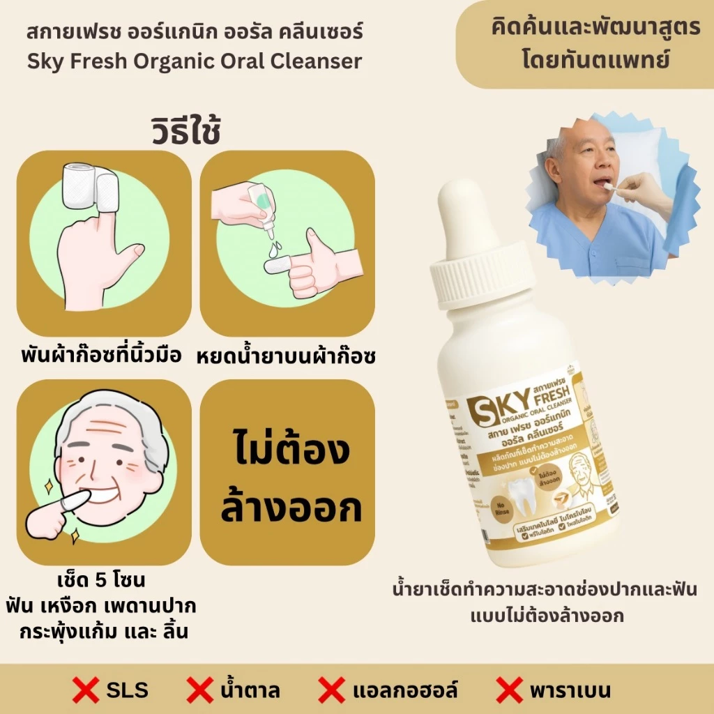 Sky Fresh Organic Oral Cleanser คือนวัตกรรมทำความสะอาดช่องปากที่ออกแบบมาเพื่อ “แก้ปัญหา” การแปรงฟันที่ทำได้ยากในผู้สูงอายุและผู้ป่วย ด้วยคอนเซปต์ “เช็ดแล้วจบ ไม่ต้องล้างออก” ช่วยขจัดคราบอาหารและแบคทีเรียในจุดที่แปรงเข้าไม่ถึง (เช่น กระพุ้งแก้ม ลิ้น เพดานปาก) ได้อย่างอ่อนโยน ให้ความรู้สึกสะอาด ชุ่มชื้น และปลอดภัยจากการสำลักน้ำ