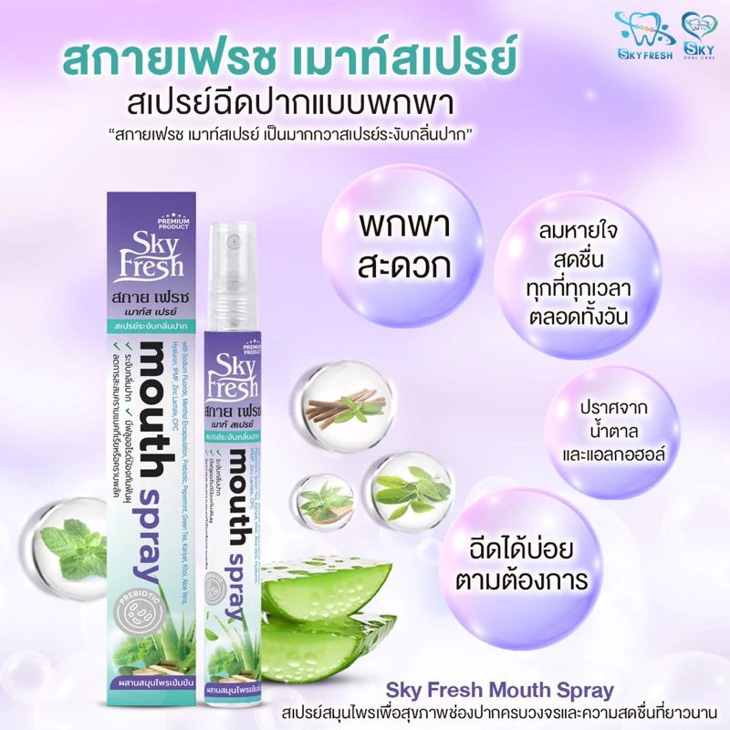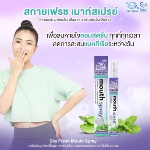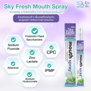 Sky Fresh Mouth Spray “เป็นมากกว่าสเปรย์ระงับกลิ่นปาก” เพราะเราใส่ใจสุขภาพช่องปากของคุณแบบครบวงจร ด้วยนวัตกรรม Encapsulated Menthol ที่ค่อยๆ ปล่อยความเย็น ให้ลมหายใจหอมสดชื่นยาวนาน พร้อมส่วนผสมดูแลช่องปากระดับพรีเมียมอย่าง Prebiotic และ Fluoride ช่วยลดแบคทีเรีย ป้องกันฟันผุ และเพิ่มความชุ่มชื้น พกพาสะดวก มั่นใจได้ตลอดทั้งวัน