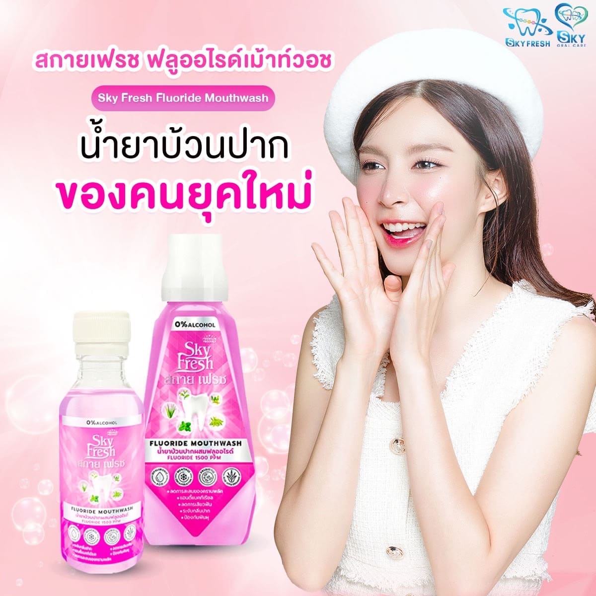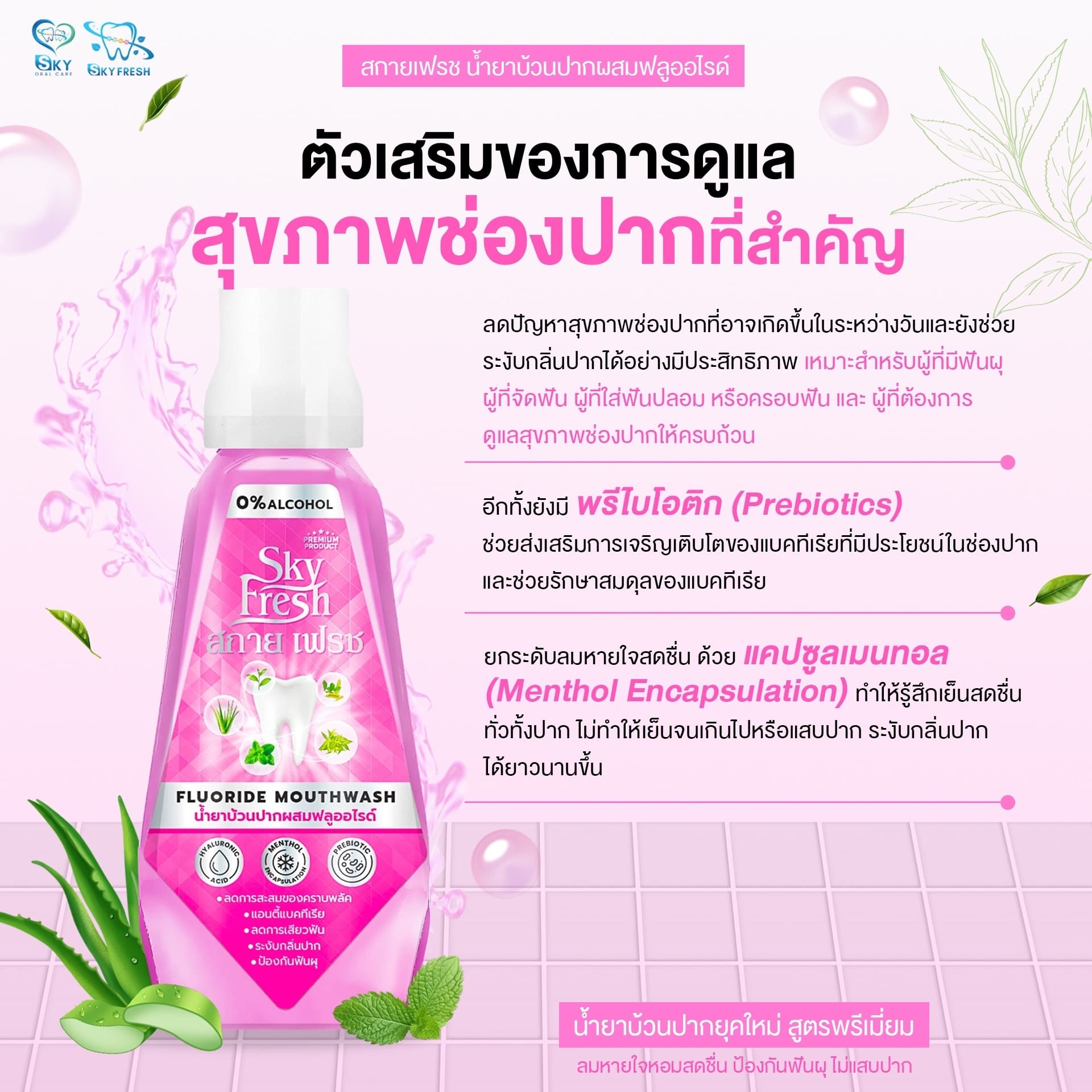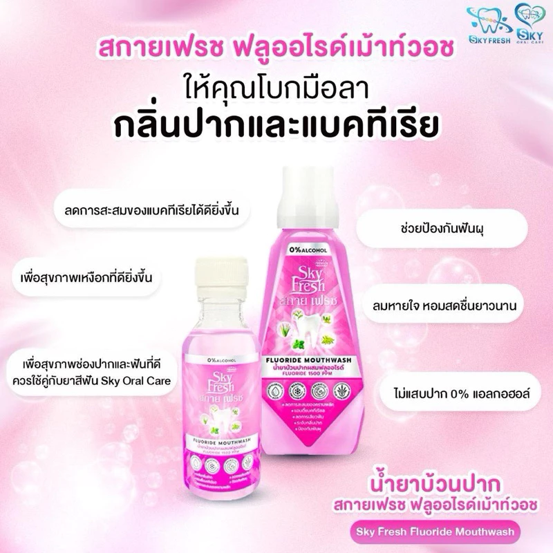 Sky Fresh Fluoride Mouthwash น้ำยาบ้วนปากคุณภาพสูงที่ออกแบบมาเพื่อการดูแลช่องปากอย่างครอบคลุม ลึกซึ้งถึงจุดที่แปรงสีฟันเข้าไม่ถึง โดดเด่นด้วยเทคโนโลยี Menthol Encapsulation ที่ค่อยๆ ปล่อยความเย็น ให้ลมหายใจหอมสดชื่นยาวนานโดยไม่แสบปาก พร้อม Prebiotics และสมุนไพรธรรมชาติ ช่วยยับยั้งแบคทีเรีย ลดคราบหินปูน และป้องกันฟันผุอย่างมีประสิทธิภาพ