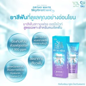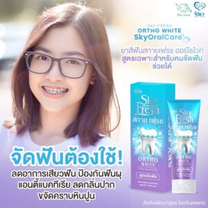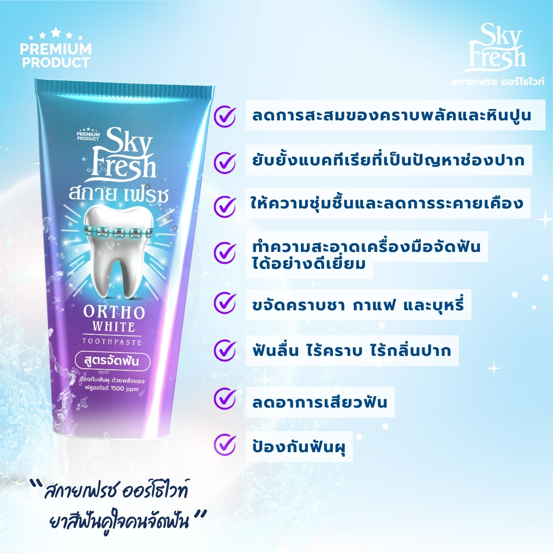 ยาสีฟัน Sky Fresh Ortho White (ยาสีฟันสกายเฟรช ออโธ ไวท์) ได้รับการพัฒนาเพื่อดูแลสุขภาพช่องปากของผู้ที่กำลังจัดฟันและหลังจากจัดฟันเสร็จแล้ว โดยเฉพาะ มุ่งเน้นไปที่การป้องกันฟันผุ ลดคราบแบคทีเรียที่ติดตามซอกฟันและเครื่องมือจัดฟัน ลดการสะสมของคราบพลัคและหินปูน รวมถึงช่วยลดปัญหากลิ่นปากได้อย่างมีประสิทธิภาพ นอกจากนี้ยังมีส่วนผสมที่ช่วยบรรเทาอาการระคายเคืองและแผลในช่องปากจากการสวมใส่เครื่องมือจัดฟันได้ดี
