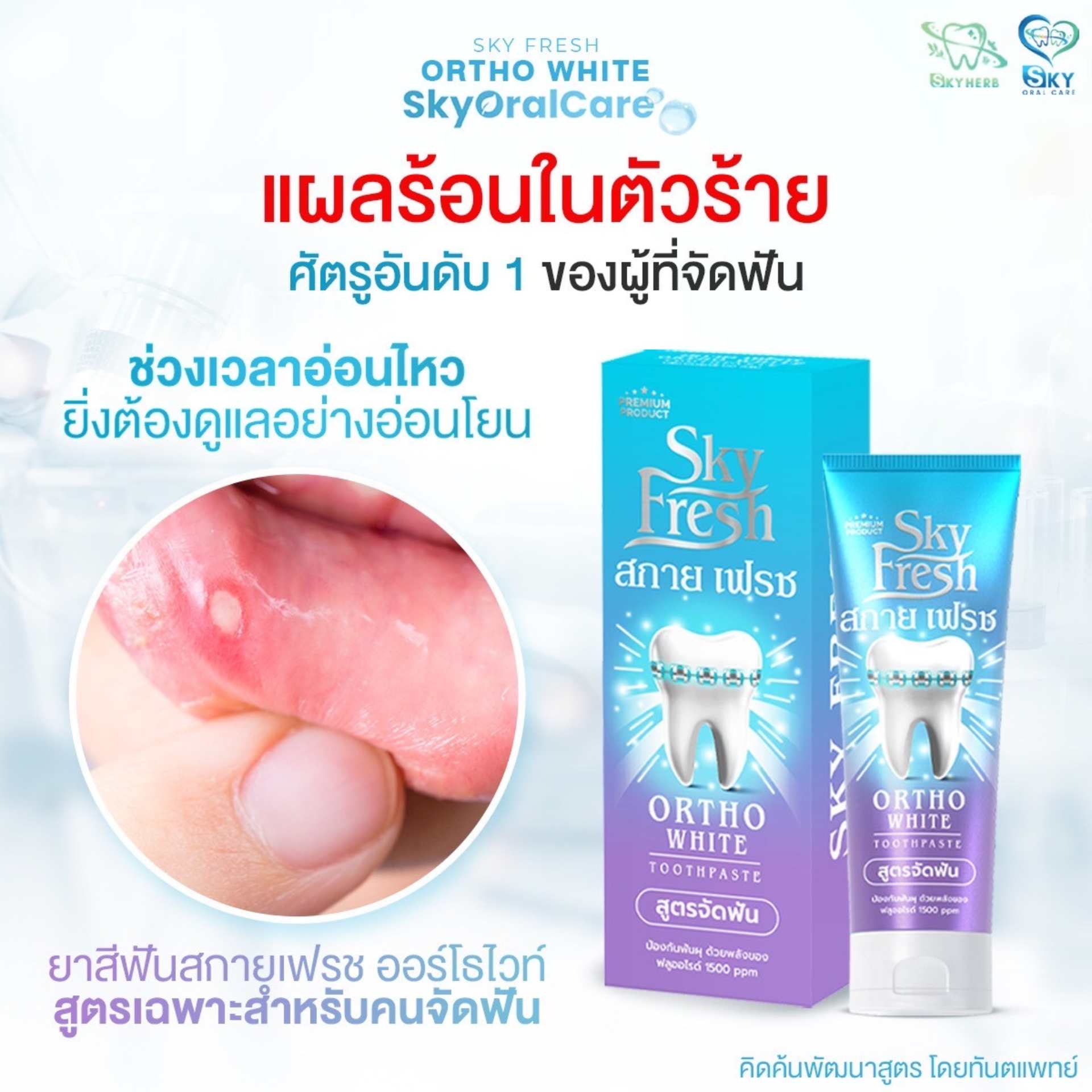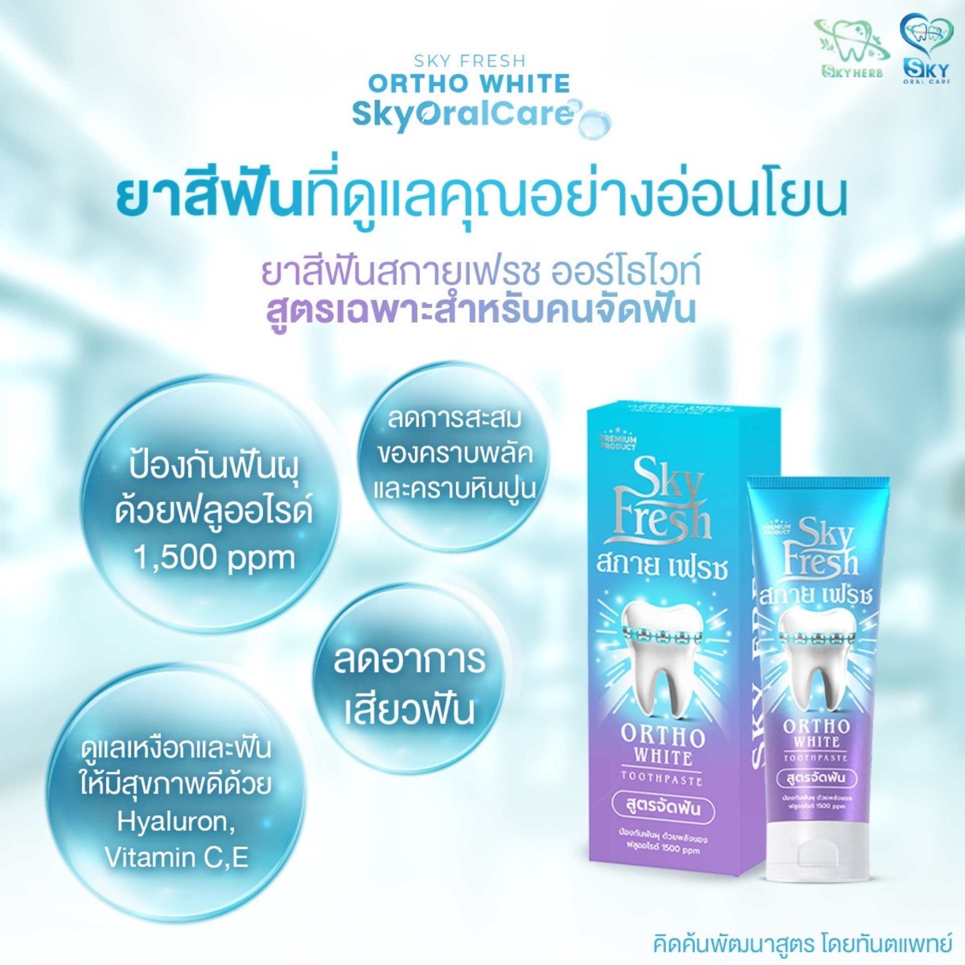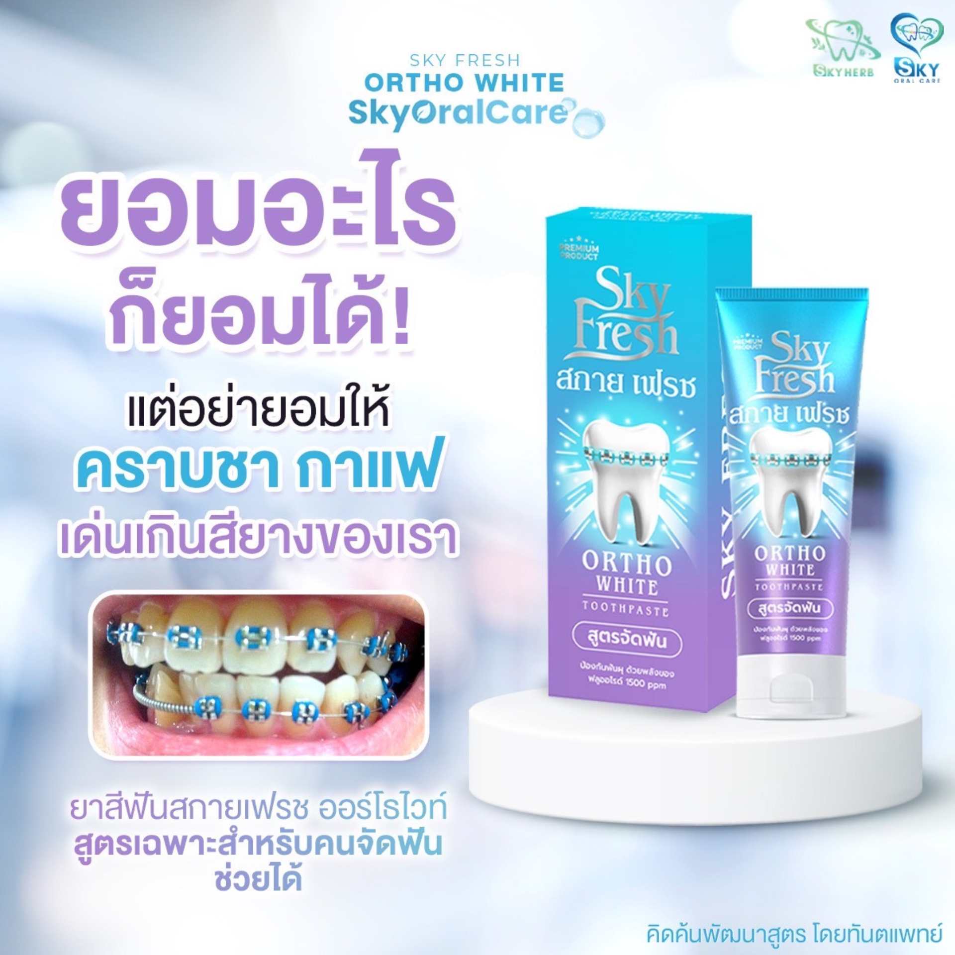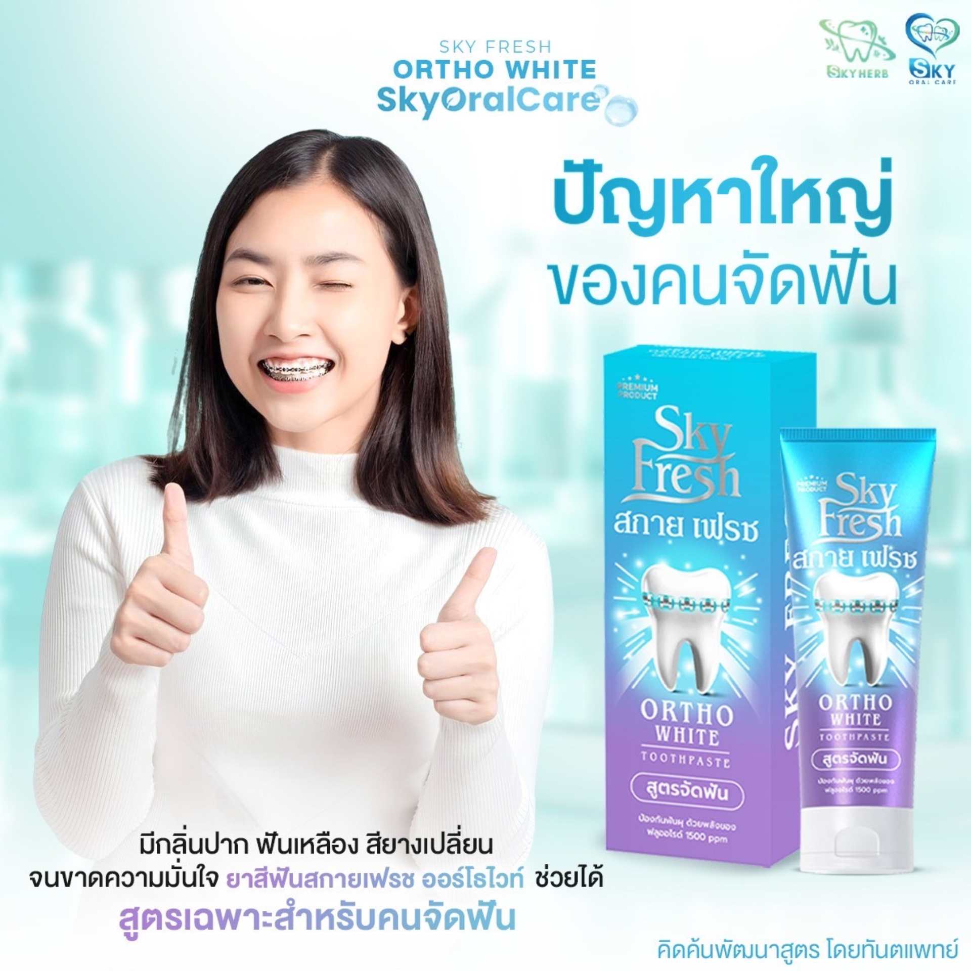 ยาสีฟัน Sky Fresh Ortho White (สูตรทันตแพทย์ สำหรับคนจัดฟัน) หมดปัญหาเศษอาหารติดเหล็ก กลิ่นปาก และฟันผุขณะจัดฟัน ด้วยนวัตกรรมทำความสะอาดล้ำลึกซอกซอนเครื่องมือจัดฟัน พร้อมดูแลเหงือกที่ระคายเคืองง่าย