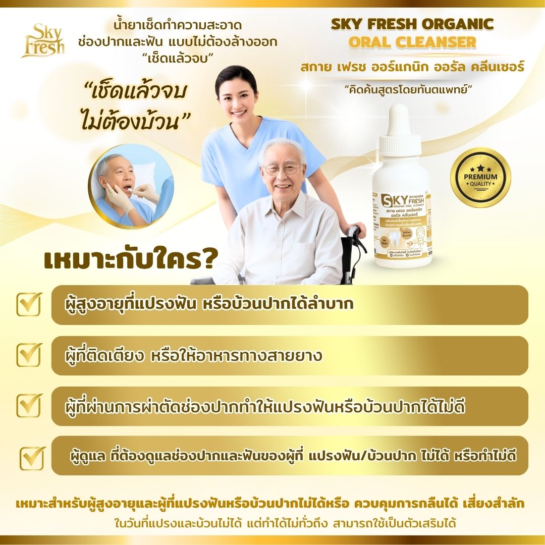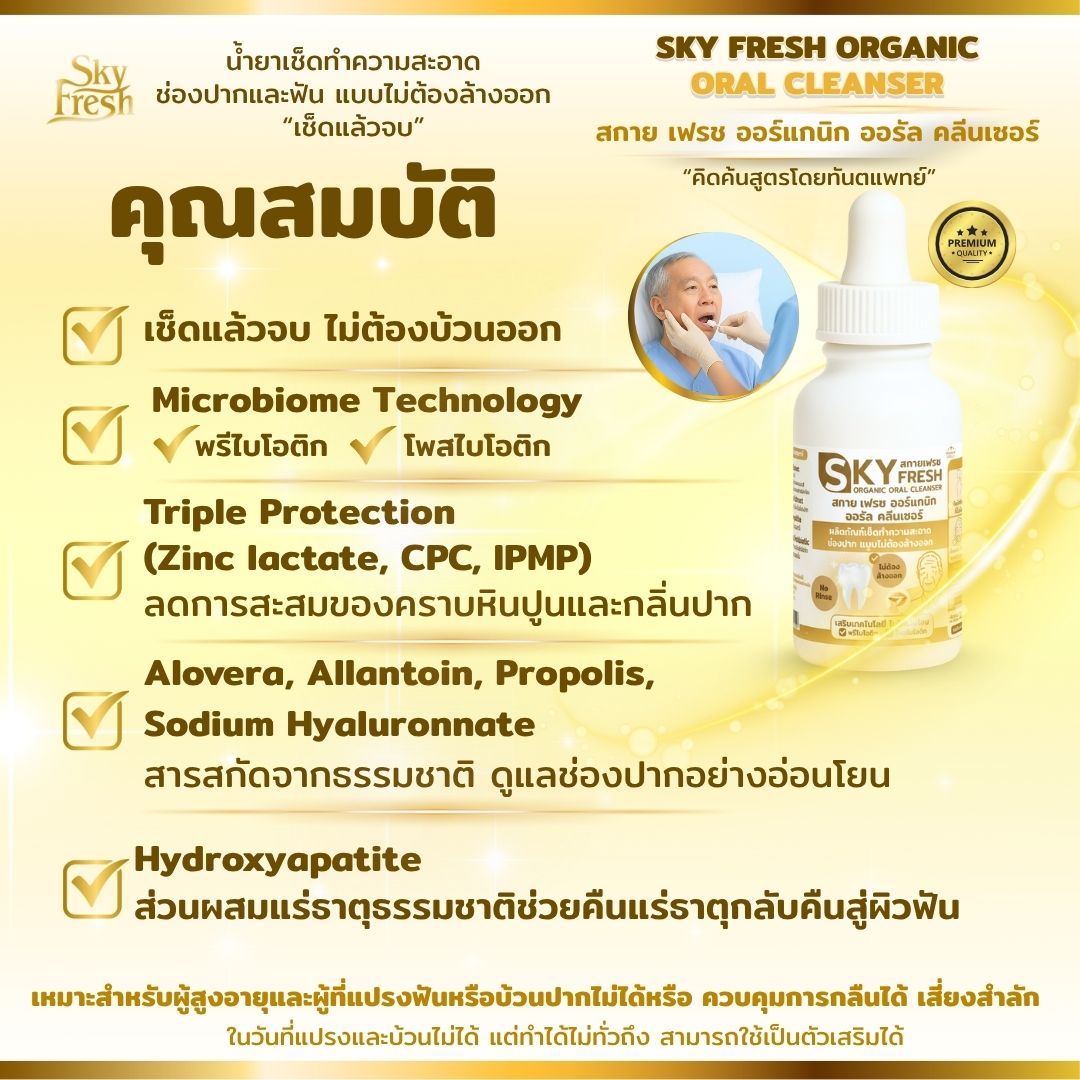 ด้วยแนวคิดนี้ จึงเกิดการพัฒนา Sky Fresh Organic Oral Cleanser (สกายเฟรช ออร์แกนิก ออรัล คลีนเซอร์)— ผลิตภัณฑ์เช็ดทำความสะอาดช่องปากและฟัน แบบไม่ต้องบ้วนออก (No-Rinse Formula) ที่สามารถใช้เสริมการแปรงฟัน หรือใช้ทดแทนน้ำสะอาดในกรณีที่ต้องการความสะดวก และให้ความชุ่มชื้นได้ดีกว่า