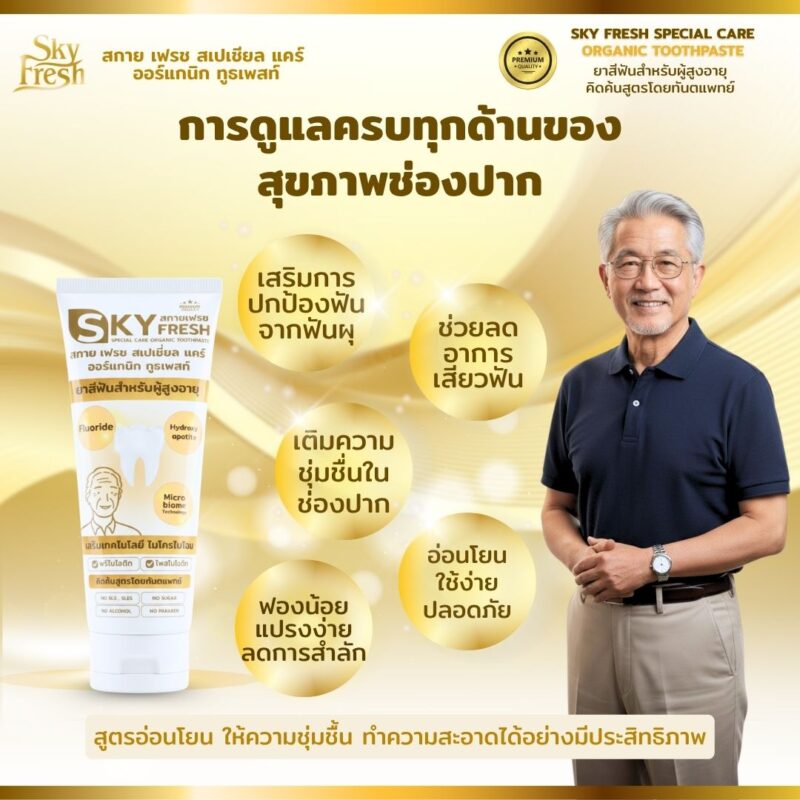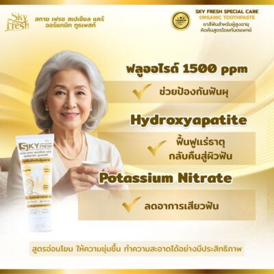 สำหรับผู้ที่มีบทบาทเป็นผู้ดูแล (Caregiver) ไม่ว่าจะดูแลผู้สูงอายุ ผู้ที่พักฟื้น หรือผู้ที่มีข้อจำกัดในการดูแลช่องปากด้วยตนเอง — Sky Fresh Special Care Organic Toothpaste ได้รับการออกแบบให้ใช้งานง่ายและปลอดภัยในบริบทนี้โดยเฉพาะ
